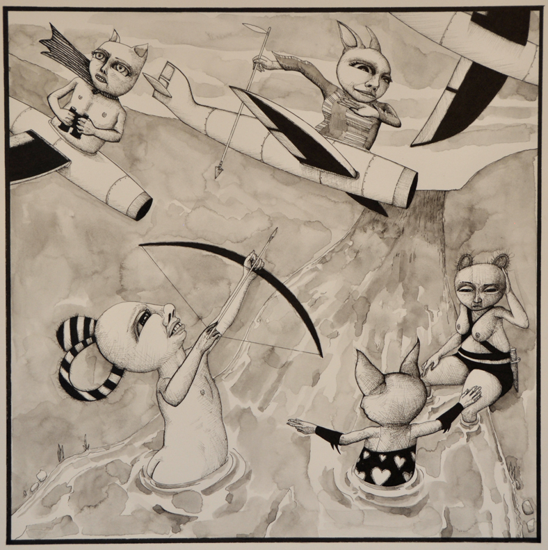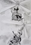 - three heroes between sorties ink/watercolor on paper 6×9 inches
