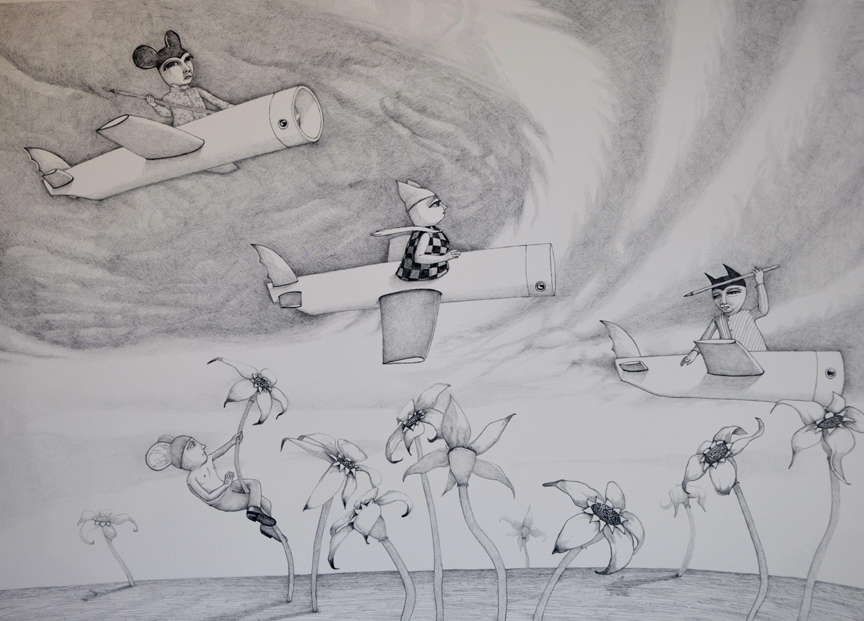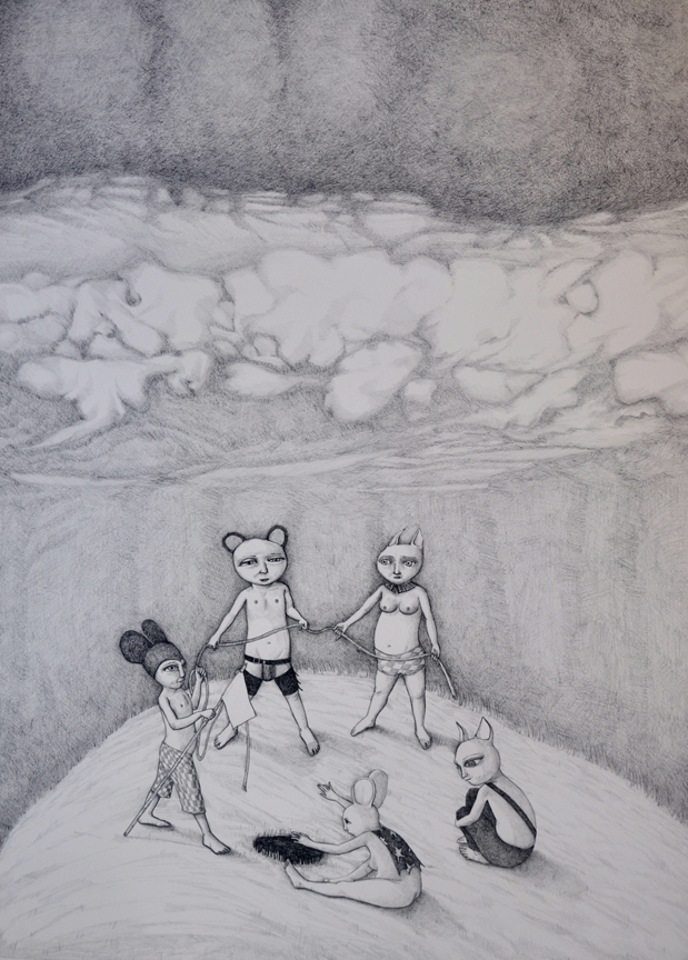 - five explorers around a hole pencil on paper 20 x 14 inches