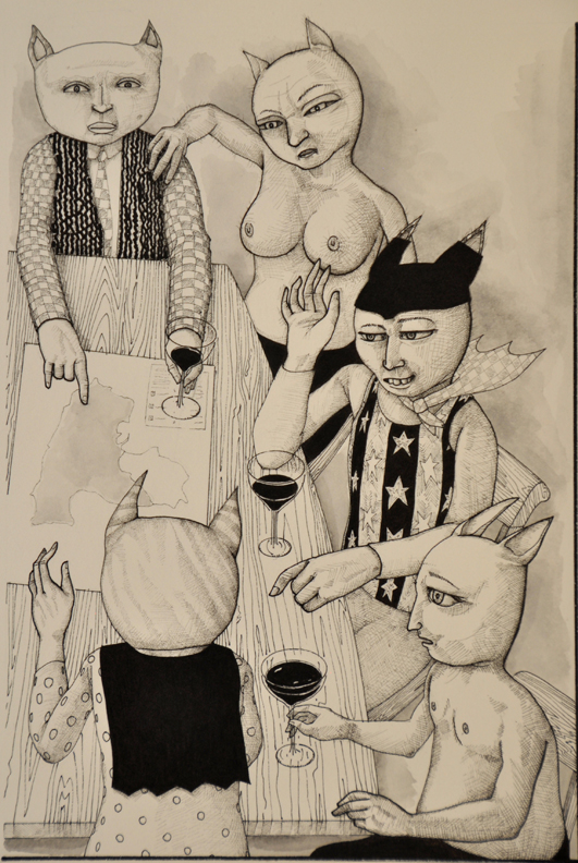 - five figures at a table ink/watercolor on paper 10.5×7.5 inches