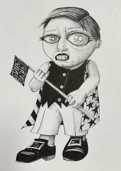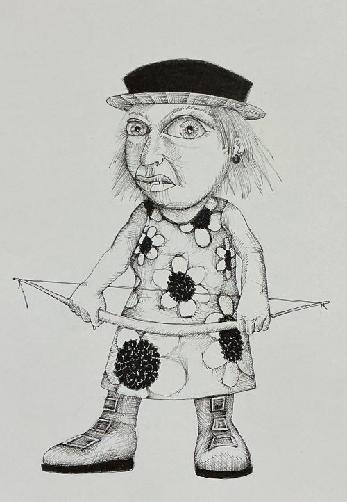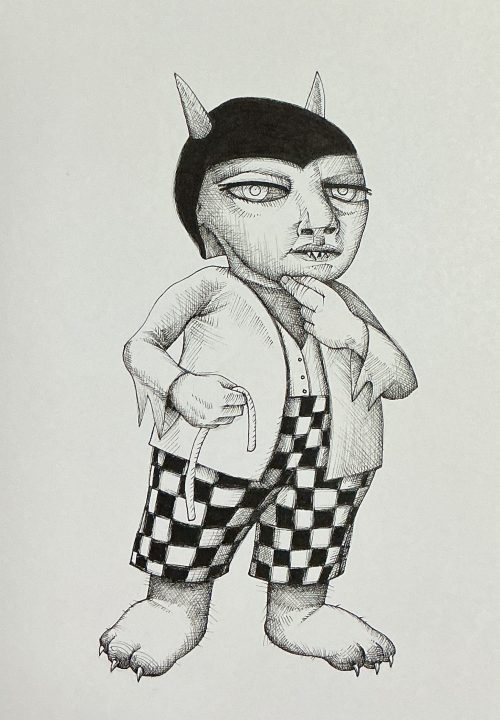 By 2023 I had completed a series of Warriors, born from some sketch ideas and polished into tiny finished pieces. Each one is 7 inches tall, 5 inches wide, rendered in black ink on high quality white paper. A few examples: